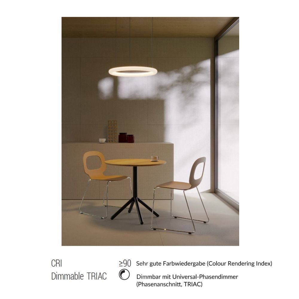 Ideal als stilvolle Ring-Hängeleuchte für Wohnzimmer, Esszimmer, Küche, Empfangsbereiche oder moderne Büros. Die Länge von Kabel und Seil beträgt 3,6 Meter, wodurch eine individuelle Anpassung an Raumhöhe und Einrichtung möglich ist. Mit einem CRI > 90 garantiert die LED Ring-Hängeleuchte natürliche Farbwiedergabe und perfektes Lichtambiente.