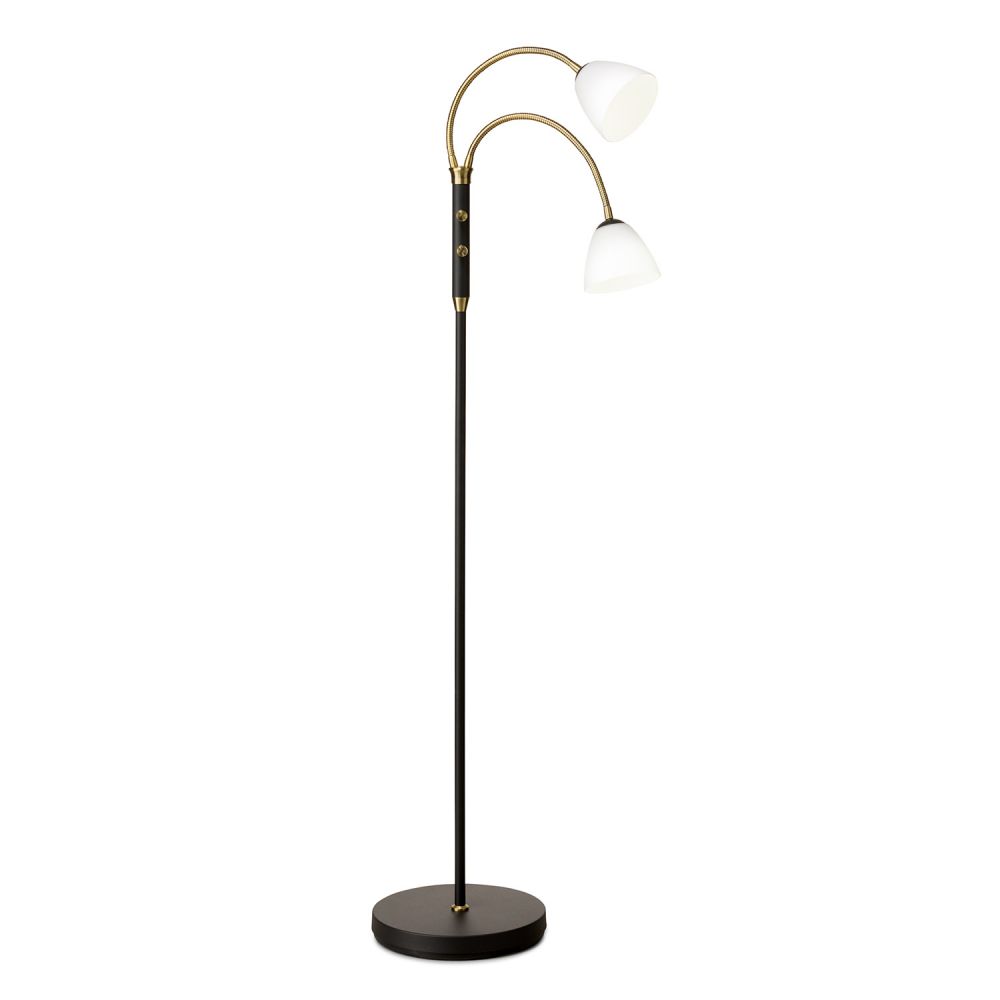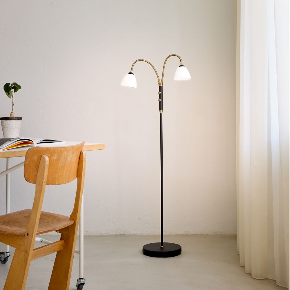 Zweiflammige dimmbare Bodenstehleuchte mit beweglichen Armen in schwarz, antikem Messing und Opalglas Skandinavische 2-flammige Bodenstehleuchte mit Metallfuß in Schwarz und gebürstetem Messing, bewegliche Arme, Schirme aus Opalglas, 140 cm hoch, mit 200 cm Kabel.