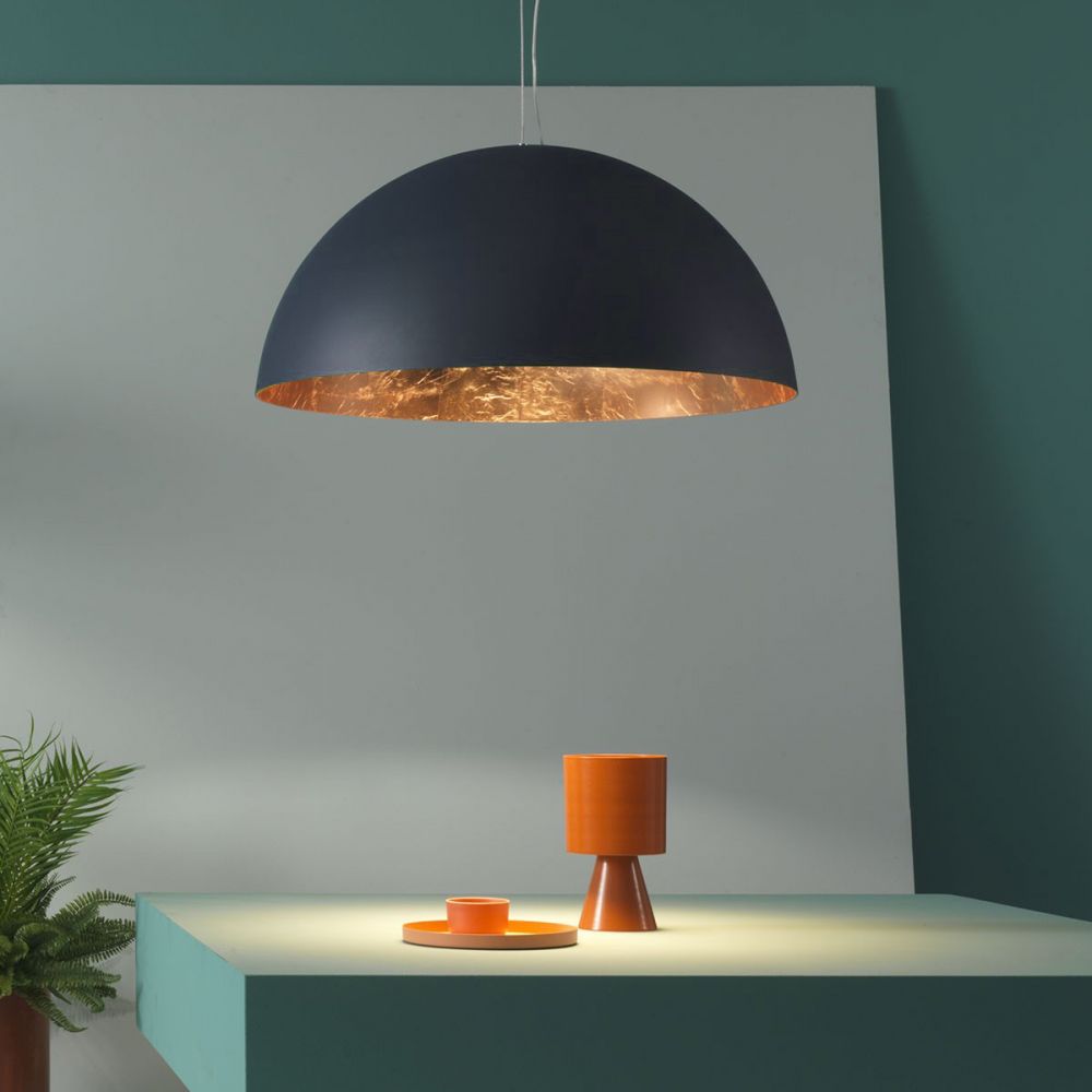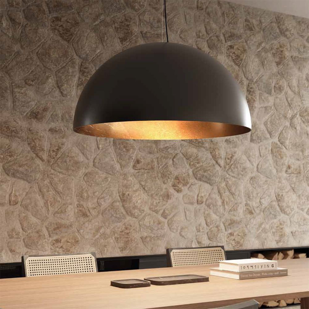 Diese halbrunde Pendelleuchte aus Metall in eleganter Bi-Color-Ausführung vereint hochwertiges italienisches Design mit individueller Farbgestaltung und eignet sich ideal als stilvolle Pendelleuchte für Esstisch oder Wohnzimmer. Die charakteristische Halbkugel-Form sorgt für eine zeitlose Optik und setzt sowohl in privaten Wohnräumen als auch in architektonisch gestalteten Objektbereichen markante Akzente.