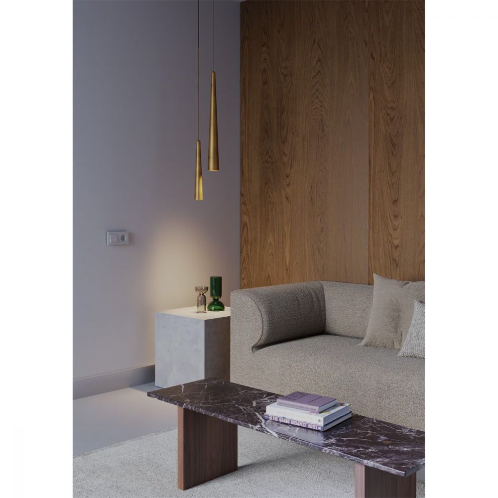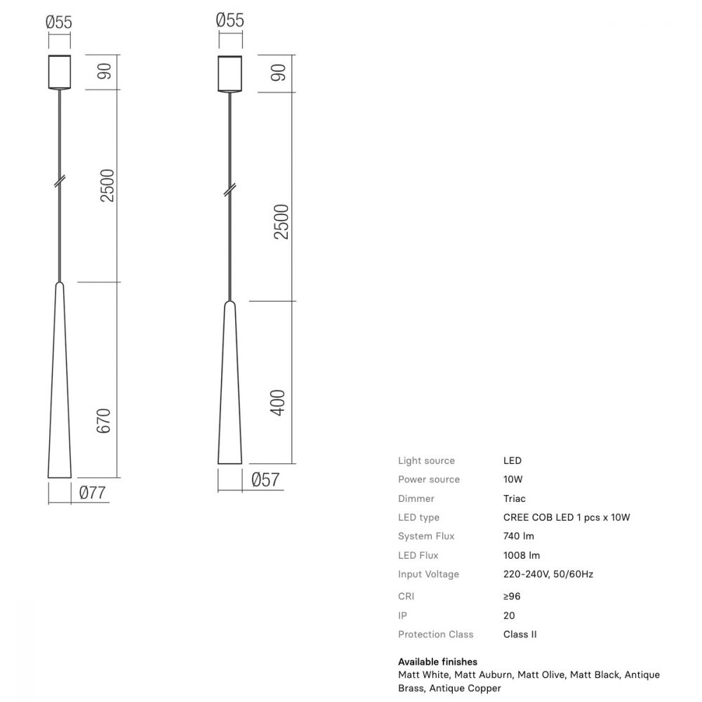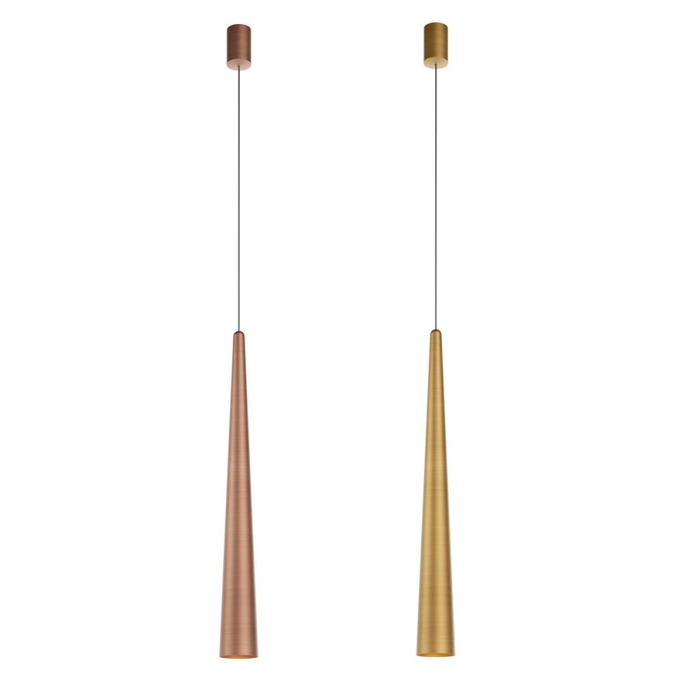 Diese moderne lange Pendelleuchte besticht durch ihre elegante, konische Form. Sie ist aus Aluminium gefertigt, mit einem Diffusor ausgestattet und in verschiedenen Farben erhältlich: Matt Weiß, Matt Rot-Braun, Matt Olivgrün, Matt Schwarz, Antikes Messing und Antikes Kupfer. Die Leuchte ist in zwei Größen erhältlich und kann so an die Gegebenheiten des Raumes angepasst werden.