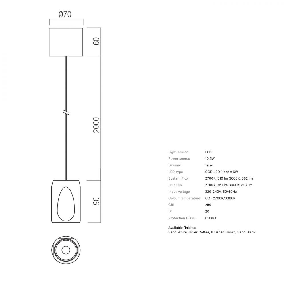 Moderne LED-Pendelleuchte im Durchmesser 7 cm und den Oberflächen Sandweiß, Silver Coffee, Sandschwarz und Braun