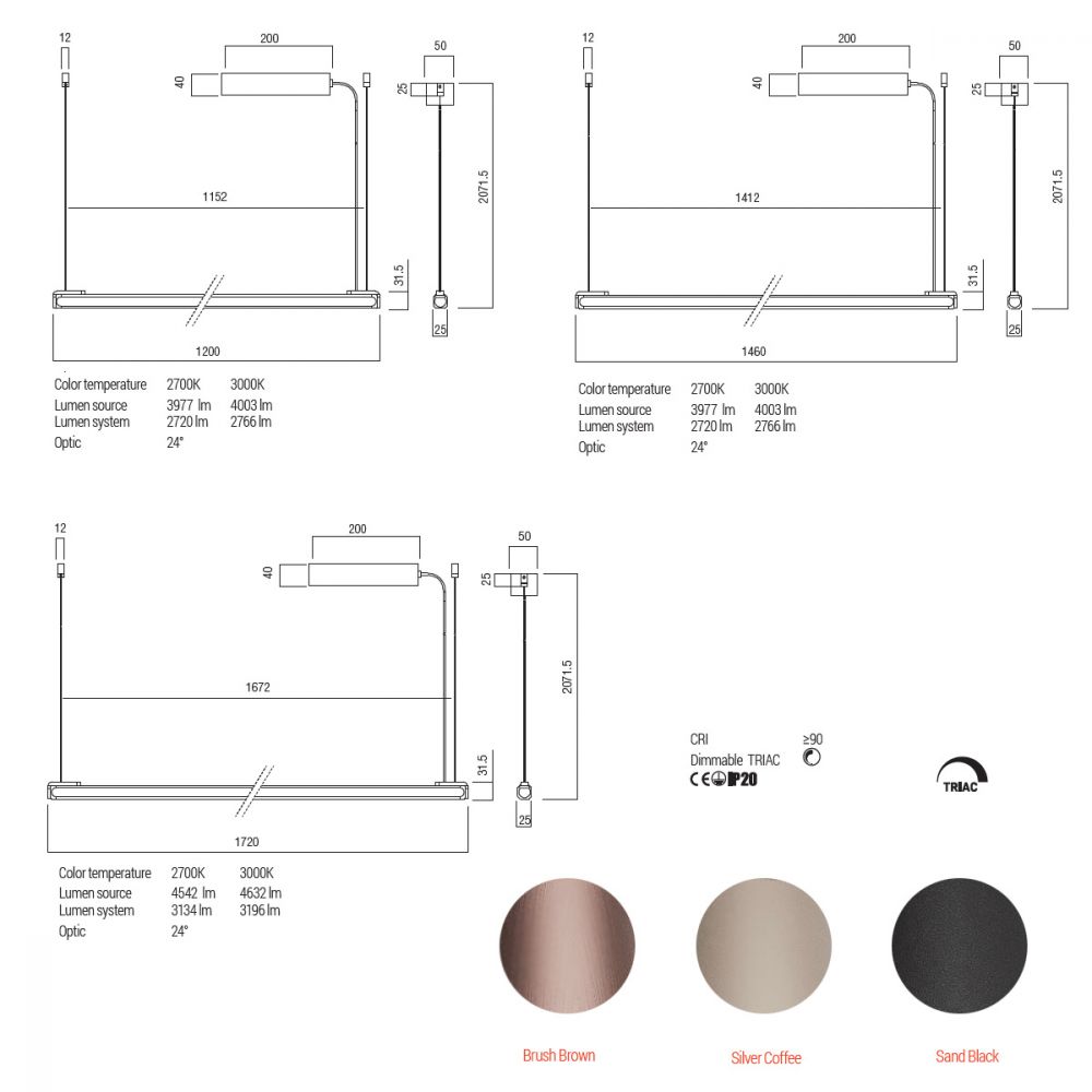 Design-Hängeleuchte in 113, 141 und 225 cm Länge und integriertem LED. Aluminiumgehäuse in den Farben Schwarz, Weiß, Schilfgrün, Kupferbraun, Graubeige.