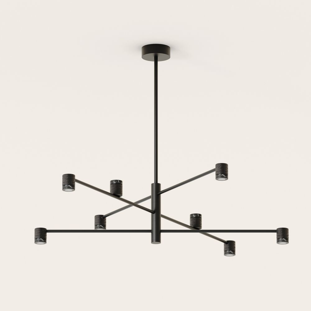 Hängeleuchte TEA des Designers Pepe Fornas besticht durch eine außergewöhnliche Kombination aus Metall und Marmor und ihre moderne Kronleuchteroptik. Das matte Schwarz der Aluminiumhalterung kombiniert mit schwarzem Marmor verleiht der Leuchte eine luxuriöse, elegante und gleichzeitig progressive Ausstrahlung. Die acht Flammen dieses innovativen Kronleuchters sitzen auf in drei Ebenen angeordneten Querstreben und sind spotartig nach unten ausgerichtet.