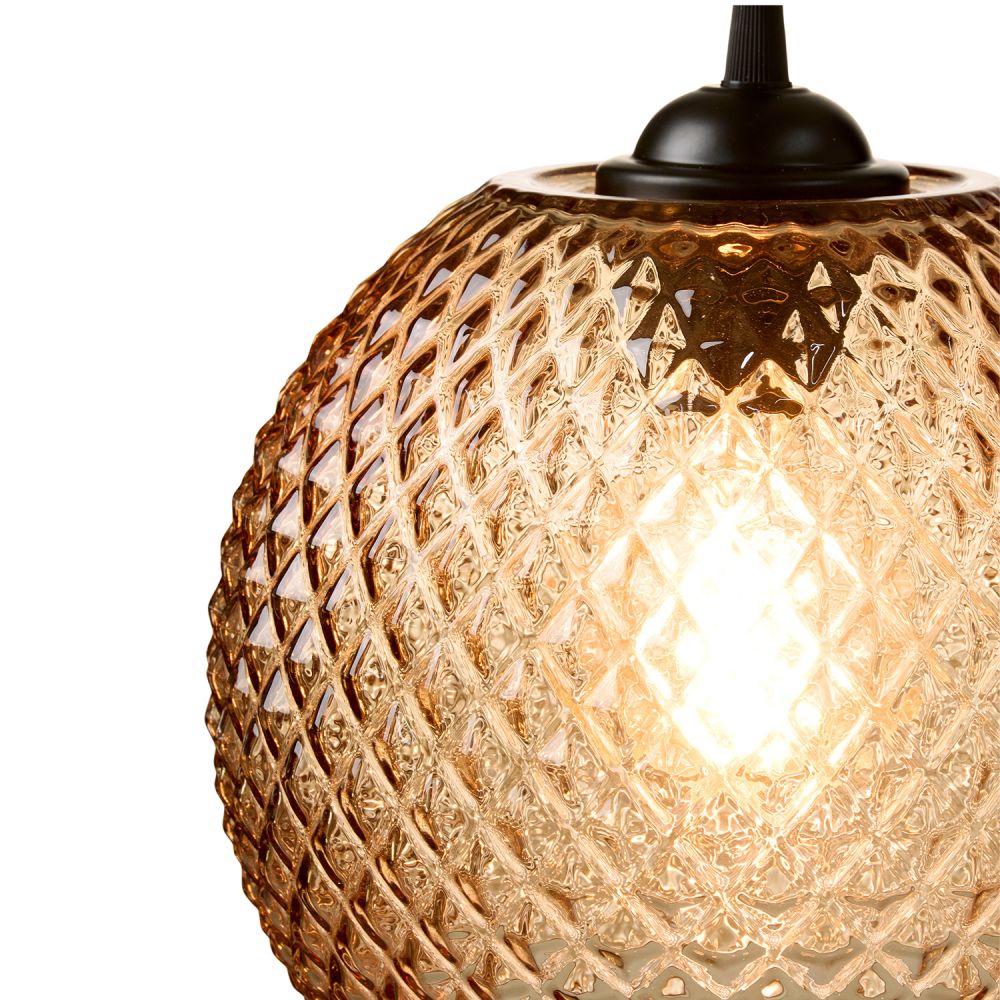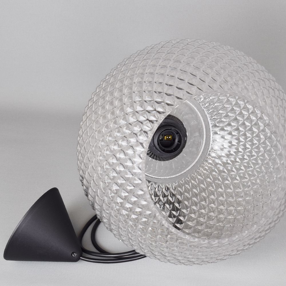 Kleine Glas-Hängeleuchte mit kugelförmigem Schirm von 12 cm Durchmesser. Ein geprägtes Karomuster gibt dem Licht Glanz. Erhältlich in Klar-, Rauch- und Amberglas.
