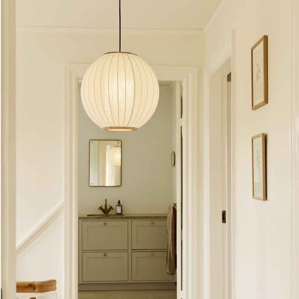Wohnliche Hängeleuchte wahlweise im Durchmesser 17 cm, 23 cm, 30 cm oder 38 cm. Der Textil-Schirm ist in klassisch bauchiger Form wie ein Tropfen gestaltet.