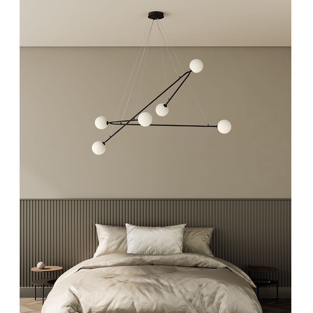 Moderne Hängeleuchte mit sechs kleinen Opalglas-Kugelgläsern verkörpert eine gelungene Balance zwischen Dekoration und Beleuchtungskörper.