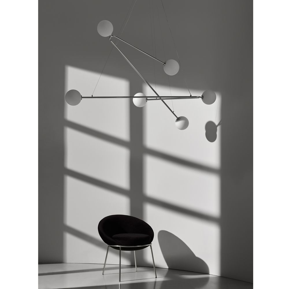 Dekorative und doch Klarheit ausstrahlende Hängeleuchte in den Oberflächen Chrom oder Schwarz matt. Als Esstischleuchte oder im Entree – die Hängeleuchte mit den sechs Kugelgläsern macht Eindruck.