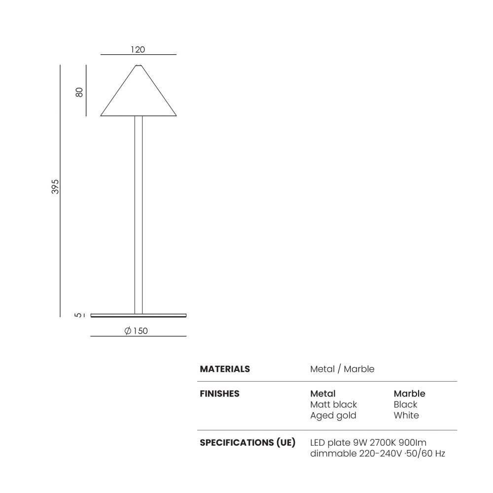 Material, Oberfläche Fuß aus Stahl, Schirm aus Marmor In den Kombinationen: Fuß Schwarz matt, Schirm schwarz oder Fuß Gold Antik, Schirm weiß Kabel schwarz