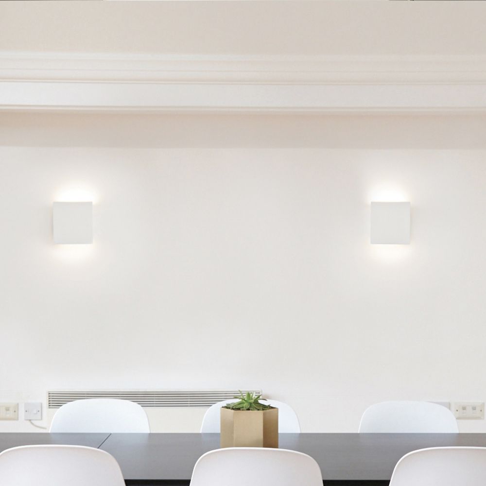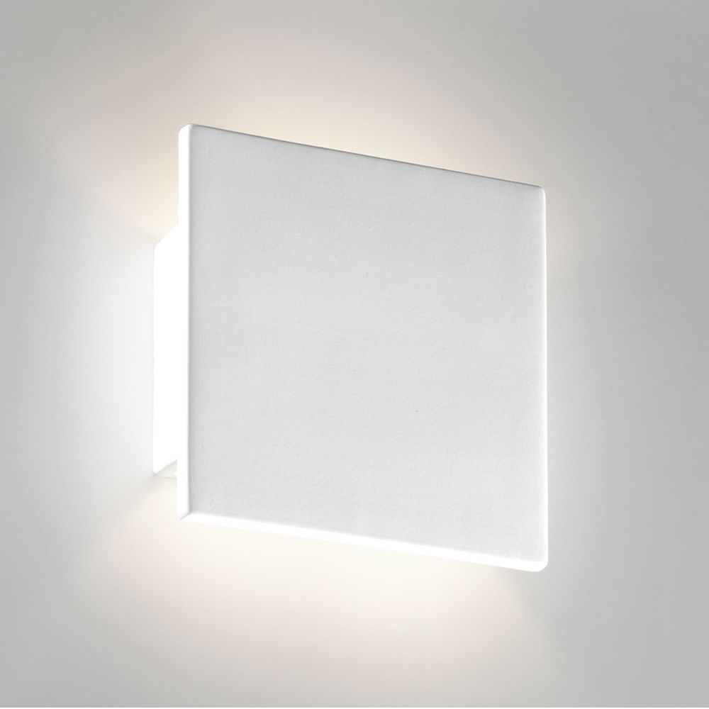 Hell strahlende Wandleuchte mit rechteckiger Blende aus Keramik. 9 W LED, wahlweise in den Lichtfarben Warm-, Neutral- oder Kaltweiß, mit Dimm-Option.